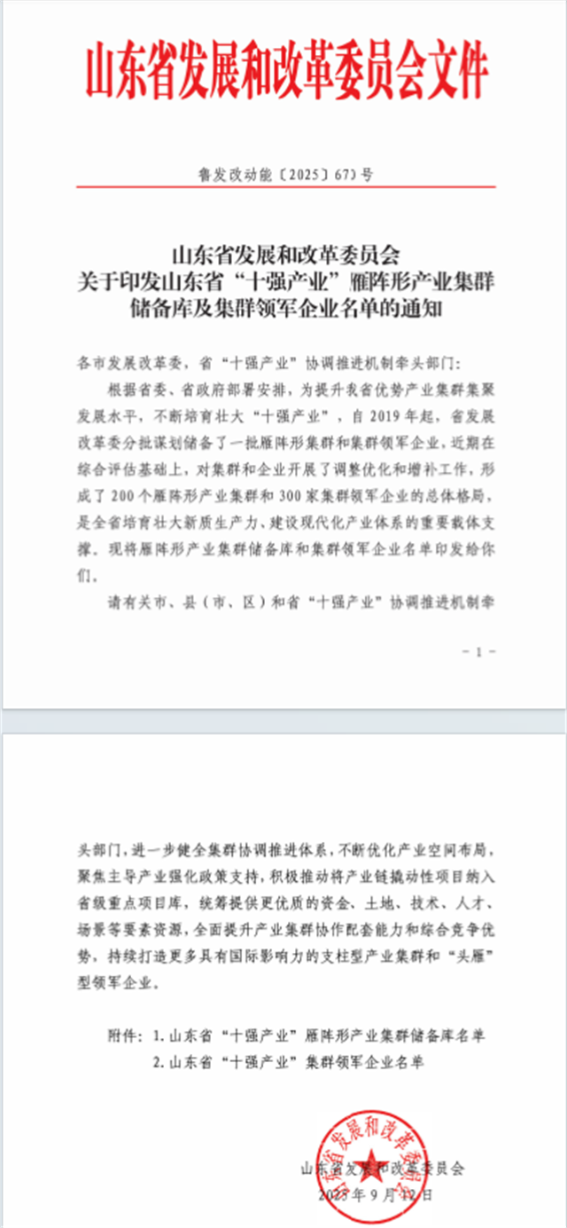 近日,省發(fā)展改革委組織開展了2025年度省“十強產(chǎn)業(yè)”雁陣形產(chǎn)業(yè)集群及集群領軍企業(yè)評選工作,經(jīng)行業(yè)評價、專家評審、綜合論證等程序,研究確定了擬增補雁陣形產(chǎn)業(yè)集群28個,集群領軍企業(yè)27家。公司憑借在行業(yè)中的顯著優(yōu)勢和綜合實力,成功入選山東省“十強產(chǎn)業(yè)”集群領軍企業(yè)。